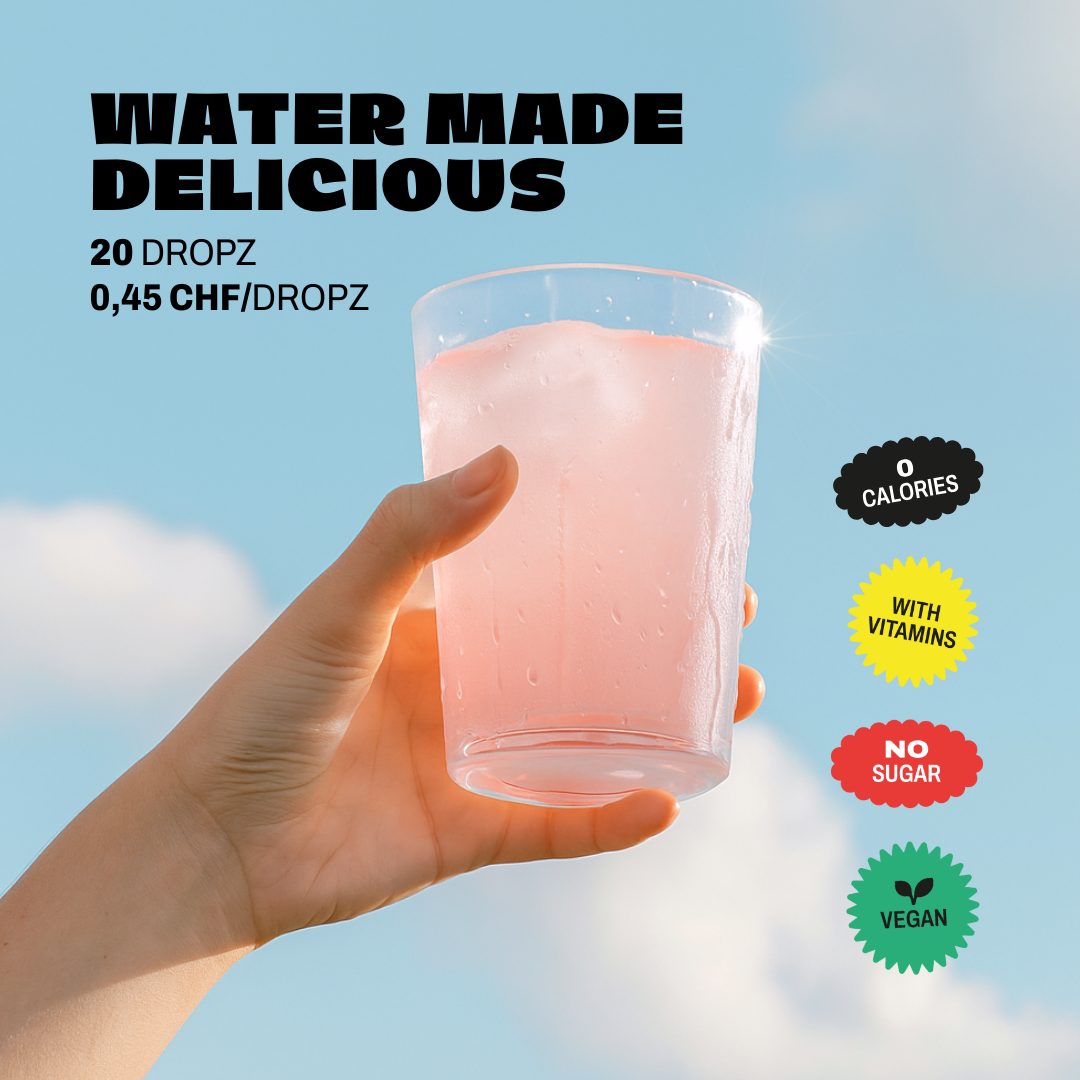 Ein Dropz reicht für 250–500 ml Wasser — je nachdem, wie intensiv du den Geschmack haben möchtest.