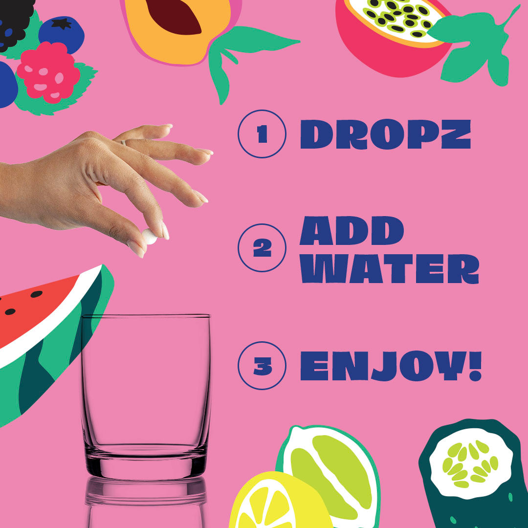 Ein Dropz reicht für 250–500 ml Wasser — je nachdem, wie intensiv du den Geschmack haben möchtest.