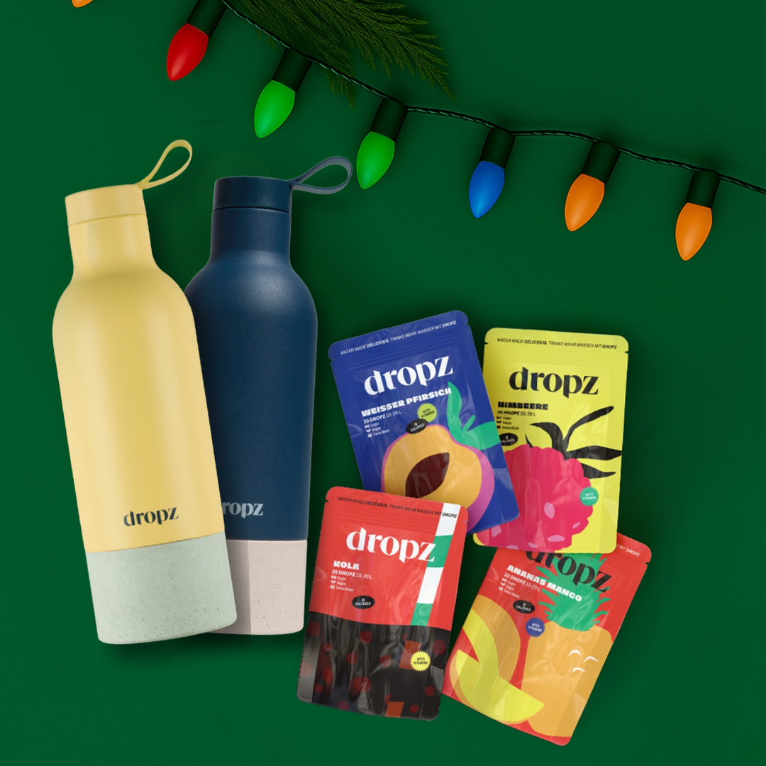 Das perfekte Geschenk fĂŒr alle, die stylische Hydration lieben â unser exklusives Christmas Set kombiniert unsere 4 beliebtesten Geschmacksrichtungen (Kola, Pfirsich, Ananas-Mango, Himbeere) mit 2 Dropz Bottles (0,5 L) in Gelb und Blau.